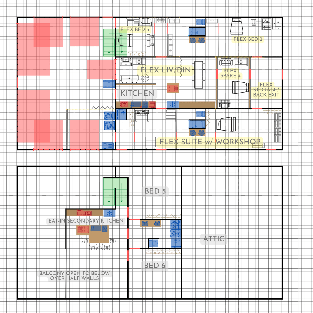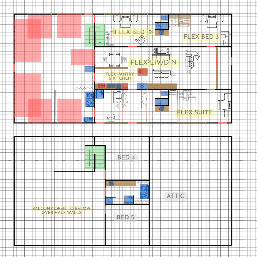 The 4 plans above depict a steel walled and framed Barndominium utilizing slide rails to make walls movable/adjustable after construction, creating flexible spaces that can change purpose.