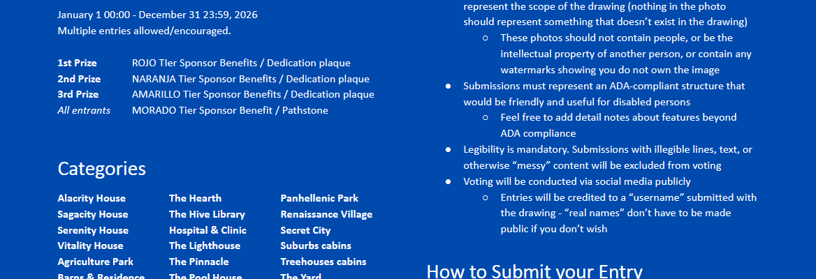 - Submissions must represent an ADA-compliant structure that would be friendly and useful for disabled persons