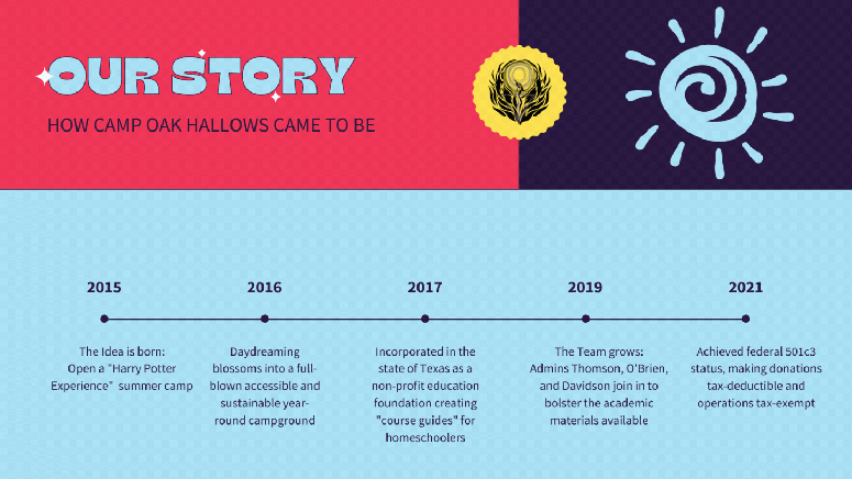 Founded in 2016 by a few friends with the passion to give the world what they needed but never had, Camp Oak Hallows is an innovative collaboration of public and private sector youth services professionals with the common goal to improve the lives of Texans, and grow strong America’s future leaders. The team is always looking to grow, and everyone is welcome.