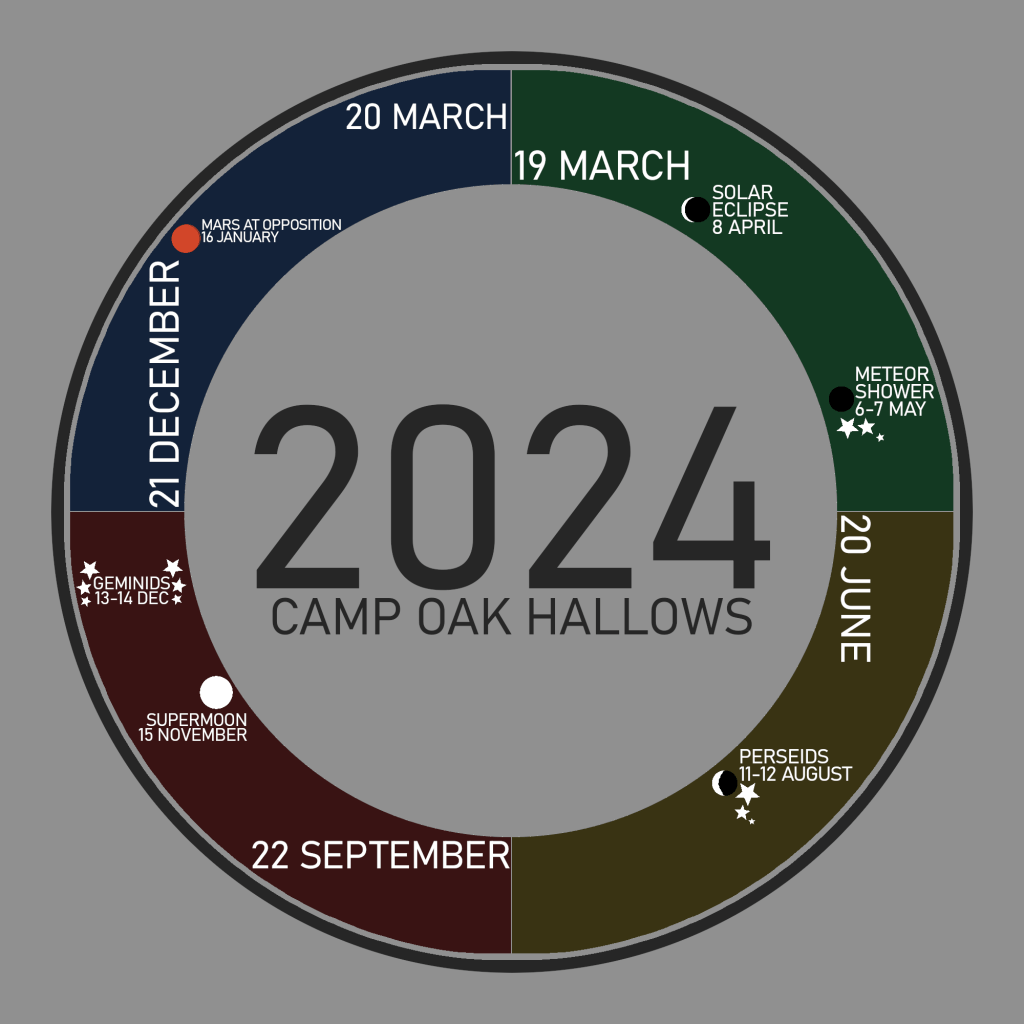 While no Camper or Student will ever be prevented from doing so, the Grounds and Staff of COH will not “celebrate” any religious or governmental holidays. Camp is open year-round, and “celebrates” on dates such as these astronomical events, with no religious or spiritual affiliation: